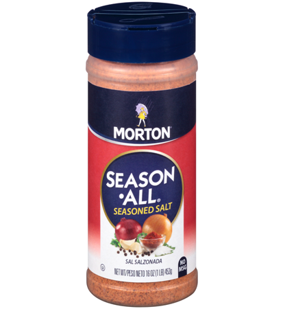 Season-All Seasoned Salt is a blend of salt and savory spices, including paprika, black pepper, onion and garlic, with a hint of chili pepper.